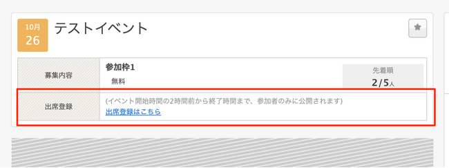 イベント毎に発行された「出席コード」を、イベント管理者が参加申し込みをした参加者に通知・提示を行い、イベント出席の際に「出席コード」を所定のリンクより入力する事で、参加者が出席情報の登録を行えます。