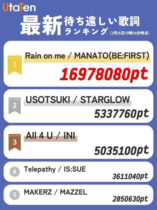 本ランキングは、UtaTen(うたてん)内の「待ち遠しいpt」をもとに、ユーザーから日々加算されるポイントの累計で順位化したものです。