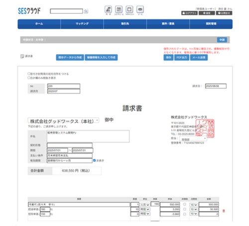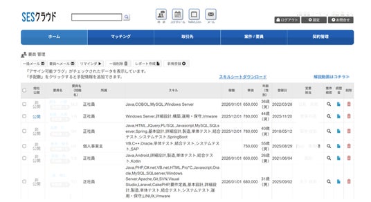 SESクラウドは、SES(システムエンジニアリングサービス)業務に特化したSES事業者向けCRMツールです。SESクラウドは、SES業務に必要な案件管理・要員管理といった管理機能から、案件と紐づいた見積書、注文書、請求書等の帳票作成・管理機能、また、仕事(案件)を発注したい企業と、仕事が欲しい企業(エンジニアを派遣したい企業)とを繋ぎ、仕事を発注したい企業と、仕事が欲しい企業、それぞれのニーズを叶えるマッチング機能を備えています。また、このマッチング機能は、サービス利用者に一部無料で公開されています。