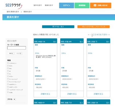 SESクラウドは、仕事(案件)を発注したい企業と、仕事が欲しい企業(エンジニアを派遣したい企業)とを繋ぐマッチング機能を持っています。様々な条件で、案件や要員を検索・閲覧することができます。本マッチング機能は有料サービスと無料サービスがあり、一部は無料で利用することが可能です。