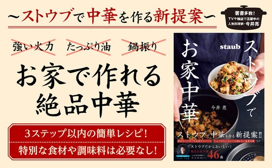ストウブだから、手軽に揃えられる食材や調味料を使って、簡単3ステップ以内のシンプルな工程で、誰もが満足できる本格的なおいしい中華をお家で作ることができるレシピ本です。