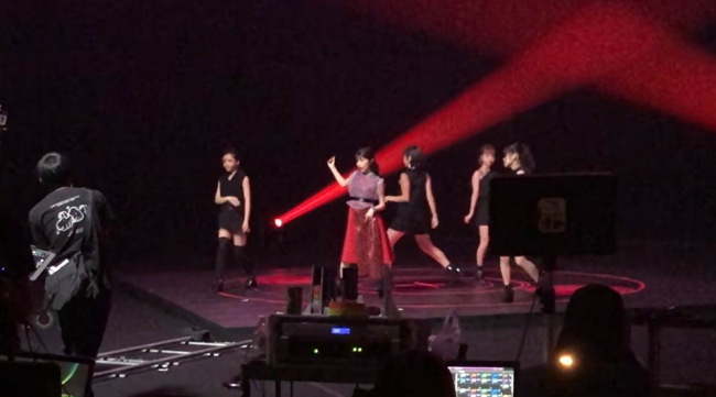 床に敷き詰めて設置している円形の『床用LEDビジョン』を、「シンギュラリティポイント」と見立て、音にシンクロしたダンスとグラフィックスを効果的に用いて、生の“CG空間”が演出されています。