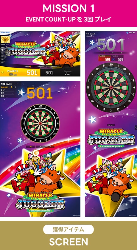 ジャグラー&フェニックスダーツのコラボ企画 第2弾を開催。ジャグラーのキャラクターが登場するカウントアップで遊んだり、ダーツのミッションをクリアして「ジャグラー」アイテムをGETしよう!