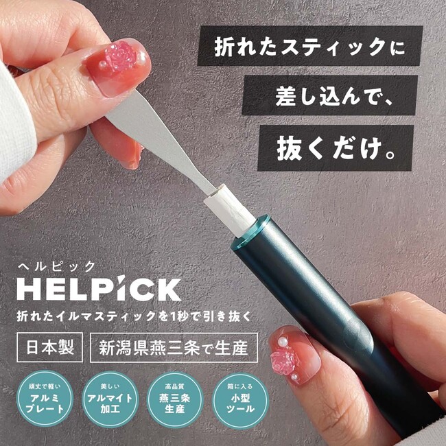 折れてしまったアイコスイルマスティックを1秒で救出するコンパクトツール「HELPiCK(ヘルピック)」が楽天市場(https://item.rakuten.co.jp/vapecollection/helpick-001/)にて販売をスタートします。