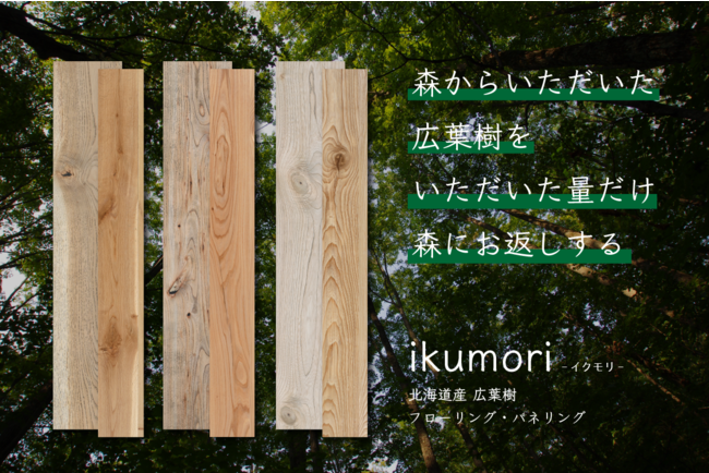 豊かな美しい森を次の世代に引き継ぐために、私たちにできることは何かと考え、注目したのが「広葉樹」です。広葉樹は豊かな表情や質感、木目の美しさなどからインテリアとしても非常に人気が高い一方で、針葉樹に比べて国内自給率が低く、多くが海外からの輸入に依存している状況です。国内のものを使用する場合は、自然更新した広葉樹に頼るしかなく、資源の持続性は大きな課題となっていました。そこで、使用した森林資源分を森に戻す取り組み、「ikumori」プロジェクトを立ち上げました。本プロジェクトでは、北海道産の広葉樹を使用した製品を製造販売し、使用した資源量に見合う苗木を再び北海道の地に植樹します。