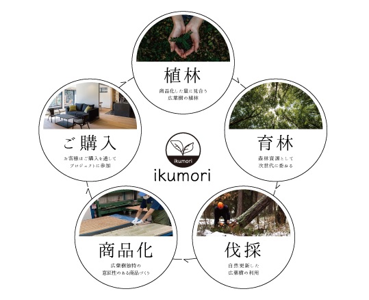 ikumoriプロジェクトでは、自然に育った北海道の広葉樹をできるだけ効率よく使用し、製品を製造販売、製品に使用した量に見合う広葉樹を植林し、将来世代に貴重な森を引き継いでいきます。また、このプロジェクトを通じ、インテリア素材を選ぶ際のエシカルな選択肢を提案します。