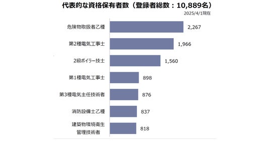 建物管理に必要な資格である電気主任技術者、建築物環境衛生管理技術者、電気工事士、ボイラー技士や建設関連で求人が多い1級施工管理技士(建築・管工事・電気)など、現場における即戦力として活躍できる人材を提供し、人手不足に悩む企業様の強力なサポート役となっています。