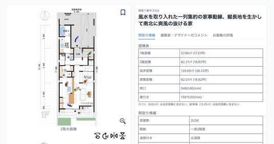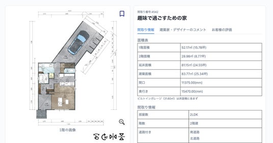 【主な検索項目】●土地の特徴による検索 ex)狭小地や傾斜地などの特徴/道路付き方位など●建物についての検索 ex)延床坪数/間口・奥行/玄関方位/nLDKなど ●施主のこだわりについての検索 ex)2WAY玄関/ヌック/インナーバルコニー/玄関直結パントリーなど