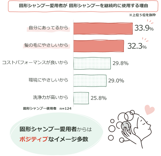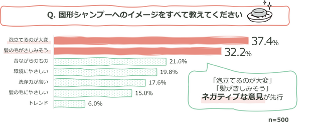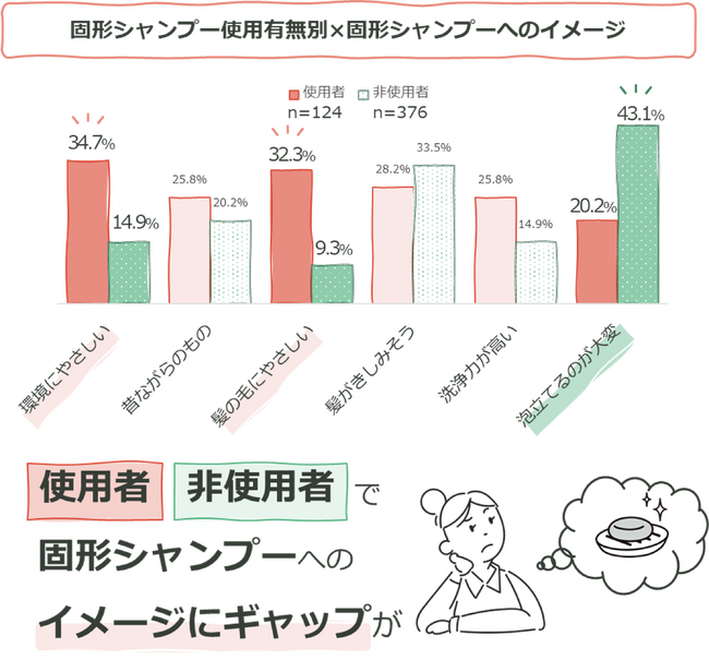 また、固形シャンプーに関する調査では、固形シャンプー未使用者と愛用者との間で意見に大きな差が見られる結果に。未使用者からは「髪がきしみそう」といったネガティブなイメージの回答が多かった一方で、固形シャンプー愛用者からは「自分にあっている」「髪にやさしい」といったポジティブな意見が多く寄せられました。
