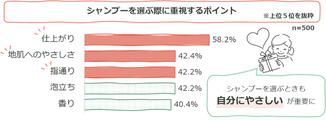 5. シャンプーを選ぶ際に重視するポイントは、1位「仕上がり(58.2%)」、2位「地肌へのやさしさ(42.4%)」