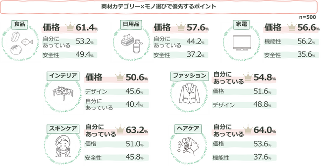 商品を購入する際に優先するポイントを聞くと、商材カテゴリーごとに大きな違いがあることが明らかに。「価格」を重視することが最も多い割合となった商材は、「食品(61.4%)」、「日用品(57.6%)」となり、日常的に購入する商品では価格を重視する傾向にあることがわかりました。一方、スキンケア・ヘアケアなど自分の身体に直接使用するものは「自分にあっている」商品を重視する割合が最も多い結果に。ファッション・インテリアでは「デザイン性」、家電では「機能性」など商材カテゴリーごとのニーズが大きく異なることが判明しました。