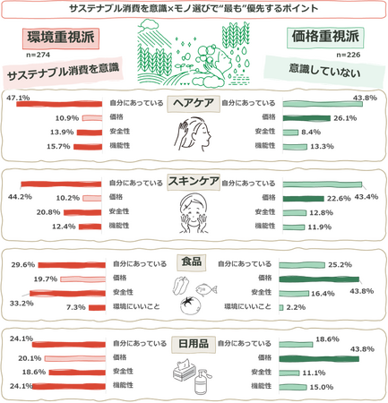 サステナブル消費に関する調査では、約2人に1人が日常的に「環境にやさしい選択」を意識していると回答。消費に関連して、商品購入時に最優先するポイントを尋ねると、選択基準は各カテゴリーごとに大きく異なることが判明しました。特にヘアケア商品では「自分にあっている」ということが重視されており、環境はもちろん、自分のニーズにあわせて選択基準を変化させていることが明らかになりました。