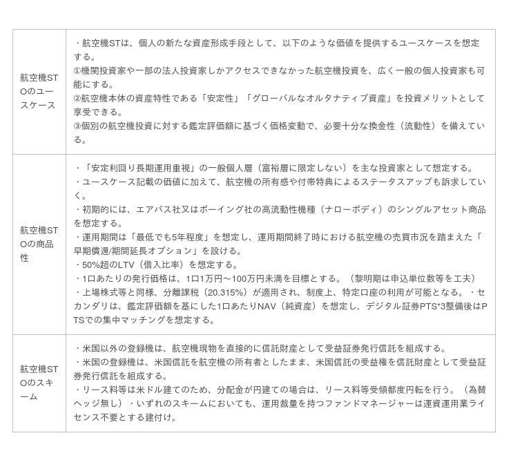 「航空機STOのユースケース」については、これまで限定的な投資家しかアクセスできなかった航空機投資をSTOにより一般化し、航空機の資産特性を投資メリットとして享受できるうえ、STならではの必要十分な換金性も備えることを想定しています。