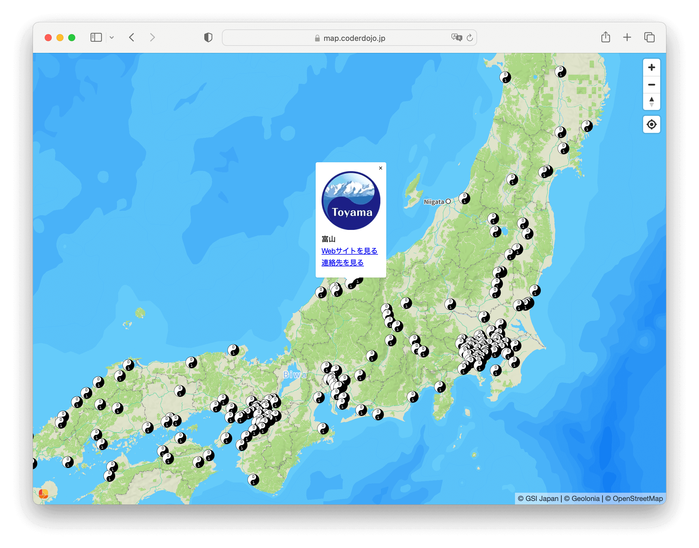 日本含む世界中の CoderDojo を地図から探せるアプリ「DojoMap」の画面 https://map.coderdojo.jp/