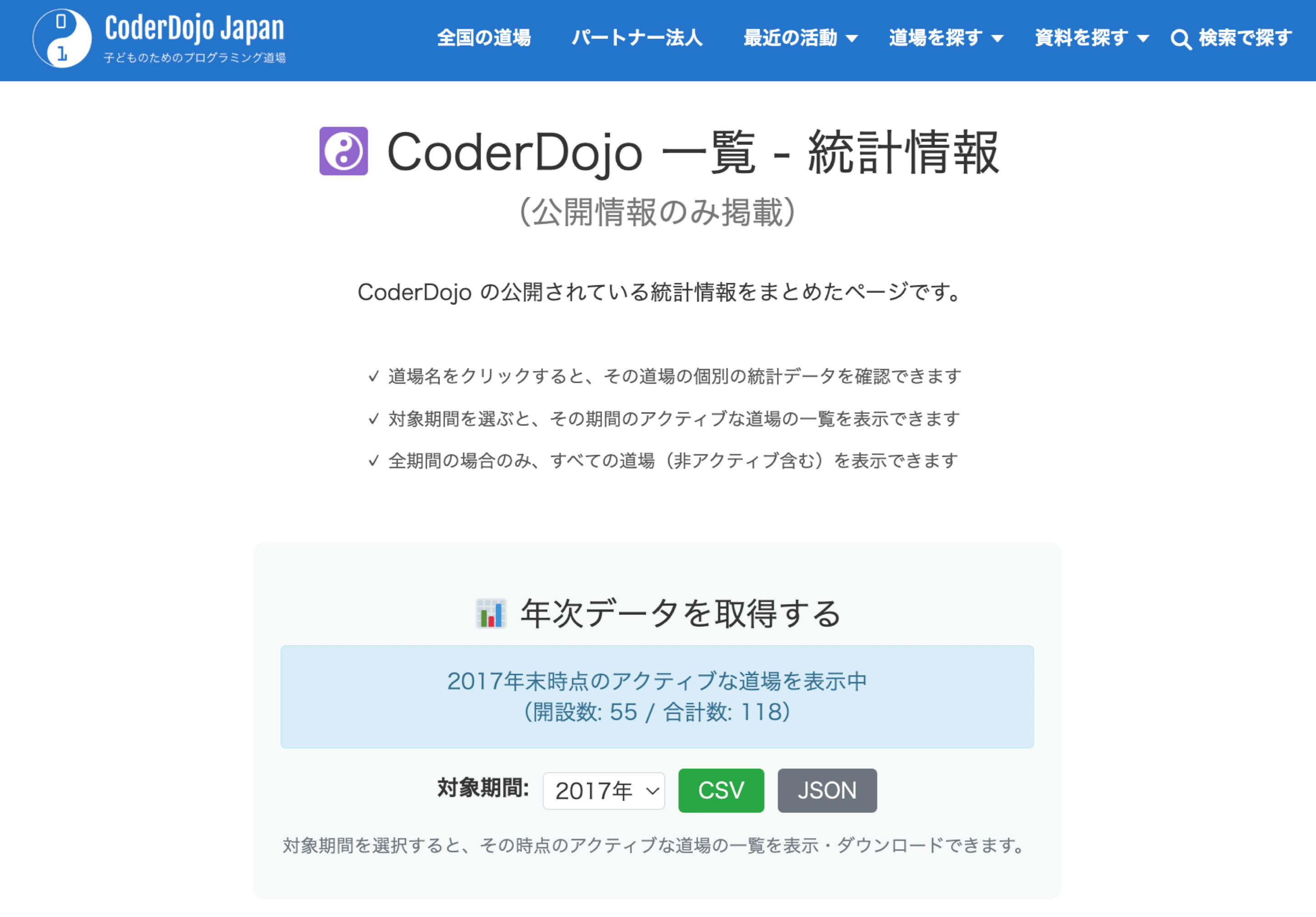 図: 2017年の CoderDojo オープンデータを機械可読なデータ形式で取得する様子: https://coderdojo.jp/dojos