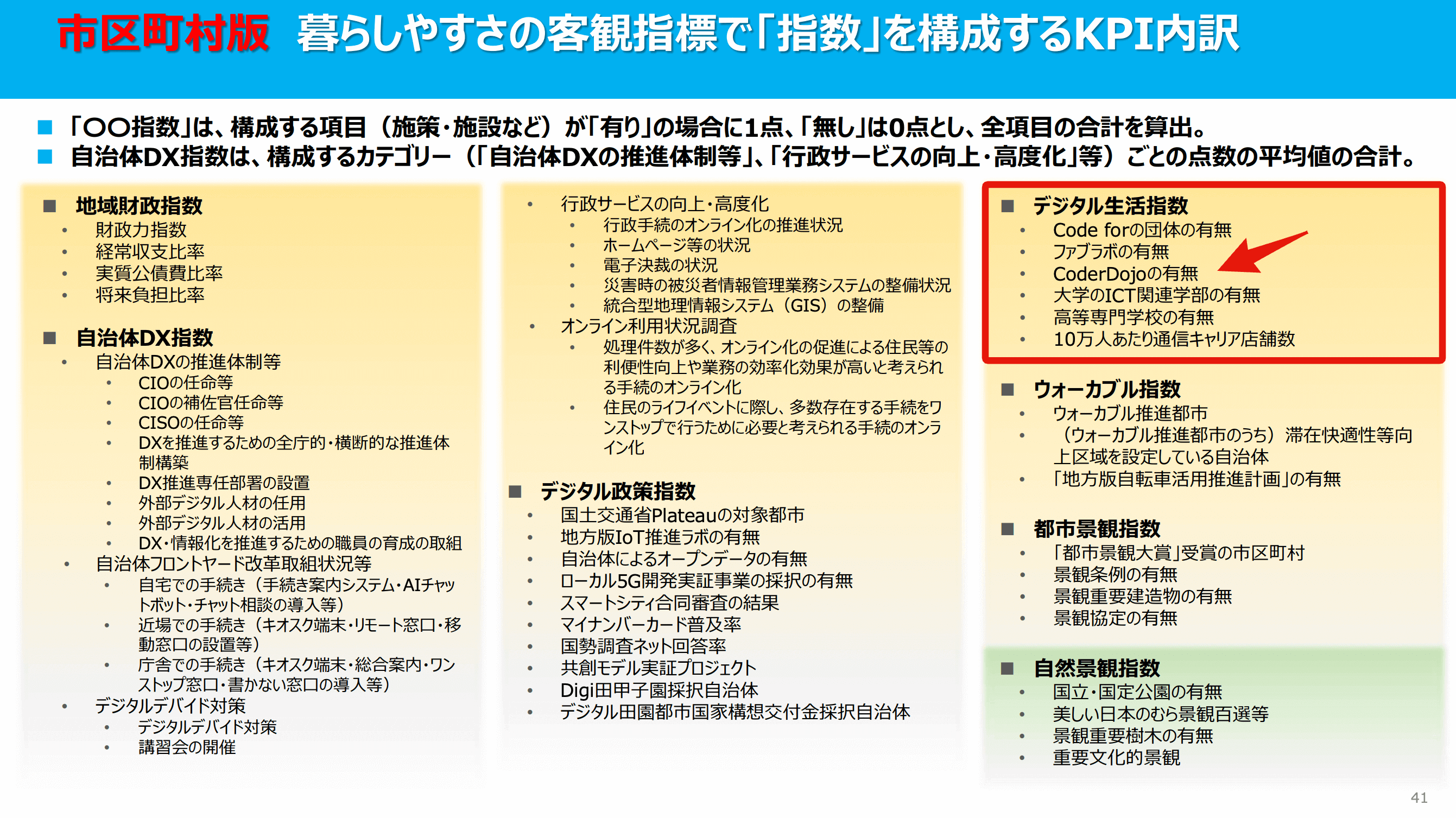 今回、同指標を構成する暮らしやすさの客観データの一部として、CoderDojo Japan が集計・公開しているオープンデータを採用していただいております。