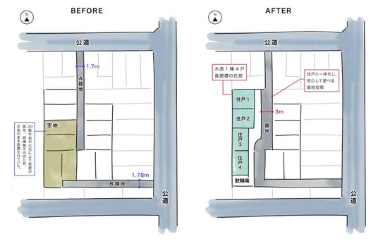 本物件も袋路にあり、20数年前の火災により長らく空地と空き家化が進んだ6区画を集約して、「都市居住推進研究会(京都市下京区西橋詰町762 会長:高田光雄)」と協働し、建築基準法第43条第2項第2号の特例許可を受けて4棟の長屋を新築しました。