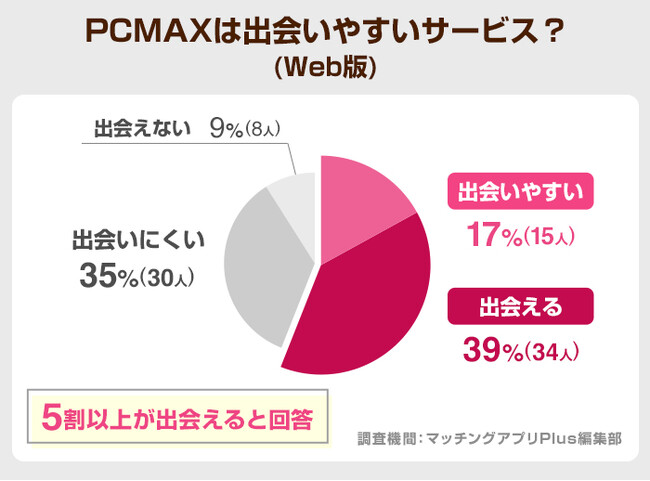 Web版のPCMAXを利用している56%が出会いやすい、もしくは出会えると回答しています。