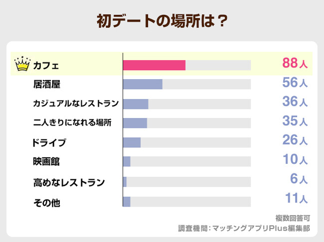 デートで最も多かったのは、49%でカフェでした。居酒屋やカジュアルなレストランも多かったですが、初めての出会いはカフェの方がハードルが低いようです。