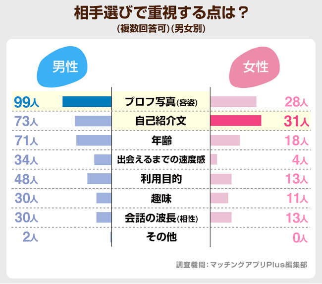 男性は、女性のプロフ写真や容姿を最も重視して相手を選んでる結果でした。