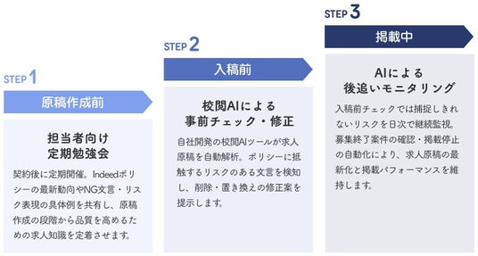 「求人サイト『Indeed』におけるポリシー厳格化への対応は前提として、その先にある採用成果の最大化こそが本来の目的です。担当者の知識底上げ・AIによる入稿前校閲・掲載中の継続監視を一体で提供することで、クライアント企業のIndeed運用を成果の出る状態で維持し続けたい。」