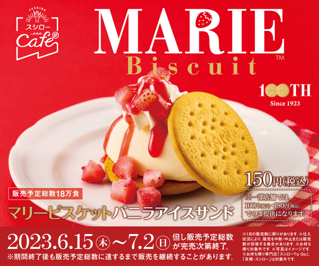 マリーと同じ丸い皿が特徴の“スシロー”とコラボ!フローズンいちごにいちごソースをバニラアイスとあわせてマリービスケットではさんだオリジナルマリービスケットサンドが新登場。丸い皿の乗った丸いマリーとバニラアイスの最強マリーアージュをお楽しみください。