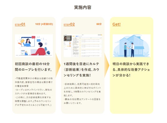 デジタルツール「リフレクトル」を活用:これまで数多くの住宅・不動産事業者様に採用され、新人の早期戦力化プログラム運用、営業力アセスメント、営業の標準モデルの整備に活用された実績のあるツールを用います。