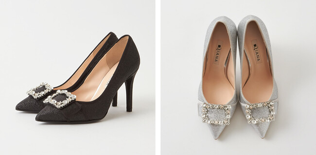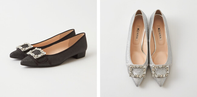 ダイアナで大人気のビジューバックルモデルの新作です。細かなリーフ型と大小様々なストーンを贅沢に使用したダイアナオリジナルのバックルを使用しています。ヒールタイプとフラットタイプ、お好みやシーンに合わせて選べるのも人気の理由。