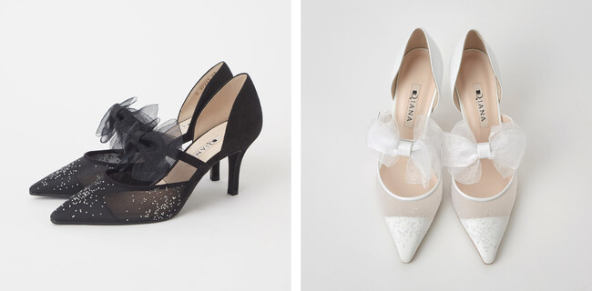 シアーオーガンジー素材のボディに、輝く粒状のメタルをあしらってスペシャルな輝き感をプラスした華やかなパンプス。シロはブライダルのシーンにもおすすめ。