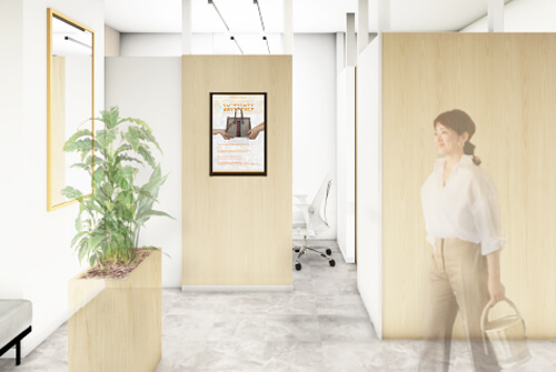 また、接客ブースはプライバシーを保てるよう半個室で、お客様とバイヤーがじっくり話ができるように設計し、ウエイティングスペースも周囲からの視線を遮るように配慮致しております。