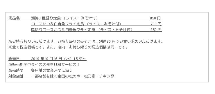 このたび松屋フーズ(本社:東京都武蔵野市、代表取締役社長:瓦葺一利)では、とんかつ専門店の「松のや・松乃家・チキン亭」におきまして、10 月16 日(水)15 時より、「秋の海鮮フェア」を開催いたします。
