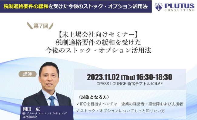 株式会社プルータス・コンサルティング(本社:東京都千代田区、代表取締役社長:野口 真人、以下「当社」といいます。)は、2023年11月2日(木)16:30~18:30に「税制適格要件の緩和を受けた今後のストック・オプション活用法」と題した対面セミナーを開催いたします。