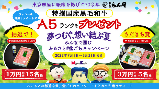 同社公式Twitterアカウント( https://twitter.com/nipponkodo_jp )をフォローの上、対象キャンペーンツイートの引用リツイートで『#盆ごち』とその画像・動画やエピソードを投稿された方の中から、入選者5名様と抽選による15名様の計20名様に、すき焼・しゃぶしゃぶの老舗「銀座らん月」の「特選国産黒毛和牛 A5ランク」のすき焼き用和牛をプレゼント。ふるってのご応募をお待ちしております。