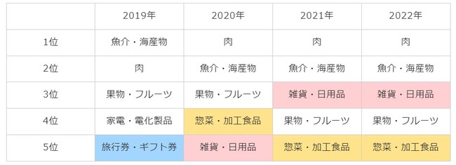 次の表は2019年からの人気カテゴリランキングTOP5を表していますが、「肉」「魚介・海産物」「果物・フルーツ」の3大人気カテゴリを除くと、「雑貨・日用品」「惣菜・加工食品」の人気が近年のトレンドとなっていることがわかります。