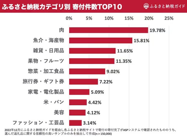 対象:2022年12月に「ふるさと納税ガイド」を経由し各ふるさと納税サイトで寄付の寄付完了が外部システムで確認されたもののうち、選んだ返礼品に関する信頼性の高いサンプルのみを抽出して作成(調査サンプル:15万件以上)