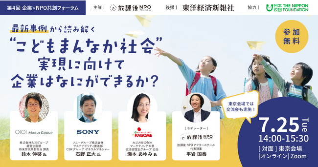 「放課後はゴールデンタイム」をビジョンに活動する特定非営利活動法人 放課後NPOアフタースクール(代表理事:平岩国泰/本部:東京都文京区/以下、放課後NPOアフタースクール)は来る7月25日(火)、「第4回企業×NPO共創フォーラム:最新事例から読み解く“こどもまんなか社会”実現に向けて企業はなにができるか?」をオンライン・対面ハイブリッド形式で開催します。(後援:株式会社 東洋経済新報社、協力:公益財団法人 日本財団)