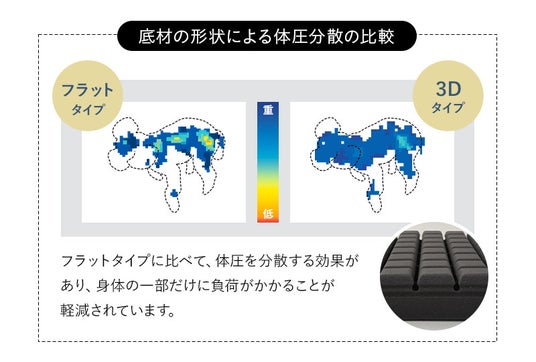 平坦なマットレスに対して、身体の凹凸があることで、局所的な負荷が生まれます。そこで、身体の凹凸に合わせて底材が変形するような3D加工を施すことで、身体をやさしく点で支えることができます。これは、密度の高い素材を使用する必要があることと、加工技術が求められることでから、人間用マットレスのハイエンドモデルとして活用されている構造です。エムールの『プレミアムドッグマットレスシリーズ』は、犬の標準的な骨格や体重をもとに人間用のマットレス素材を調整した特注素材を採用しています。