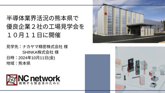 製造業ビジネスマッチングプラットフォーム「エミダス」を運営する 株式会社NCネットワーク(本社:東京都台東区、代表取締役社長:内原 康雄)は、ナカヤマ精密株式会社(本社:大阪府大阪市、代表取締役社長 中山愼一)のテクニカルセンターと、SHINKA株式会社(本社:熊本県合志市、代表取締役 國武就)の見学会を10月11日(金)に開催します。対象は中小製造業の経営者で、半導体業界活況の中、新工場を建設した熊本県の2社から半導体業界の動向を伺います。