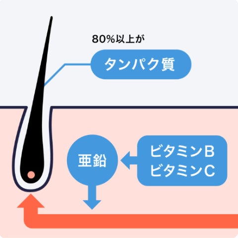 髪の毛の80%以上がタンパク質でつくられています。そのため、タンパク質を摂取しつつ、タンパク質の生成をサポートする亜鉛やビタミンを同時に摂ることが重要です。このタンパク質(アミノ酸)、亜鉛、ビタミンが髪の成長に重要な三大栄養素です。