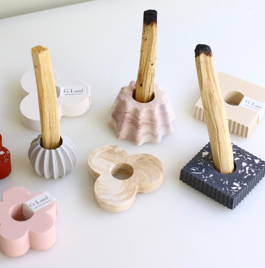 人体と環境に優しいVOC、有機溶剤フリーのエコストーン。自社アトリエにてひとつひとつ手作りで作られています。素材には廃棄されるはずの「ロスフラワー」を再利用し、廃棄花を無くす取り組みも行っています。Eco Stone Palo Santo Holder 税込1,100円~