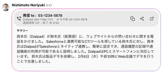 Ai機能を先行して利用できるDialpadアーリーアダプタープログラム (EAP) には、国内の大手企業を含む60社以上が参加しており、Ai要約が通話ログの一貫性向上と大幅な時間削減を実現できることが確認されています。