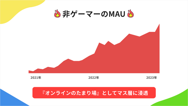 当時は友達とオンラインゲームをするためにパラレルを使う、いわゆる"ゲーマー”がユーザーの大半を占めていましたが、友達同士の口コミを起点とし、普段あまりゲームをしないマス層である"非ゲーマー”にも拡がりました。現在は、放課後や暇な時間に友達と主におしゃべりをする場としてパラレルを使うユースケースが大きく伸びており(下図:非ゲーマーのMAU)、2022年3月~2023年3月の前年月対比の平均成長率は210%となりました。パラレル全体のMAUもサービスリリース以降、右肩あがりに伸び続けています。