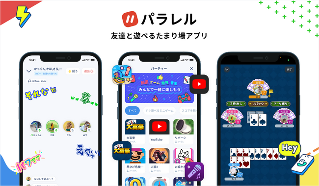 パラレルは、仲の良い友達とおしゃべりしながら様々なミニゲームで遊んだり、動画や音楽を同時視聴したり、カラオケなどを楽しんだりすることができるオンラインのたまり場SNSです。