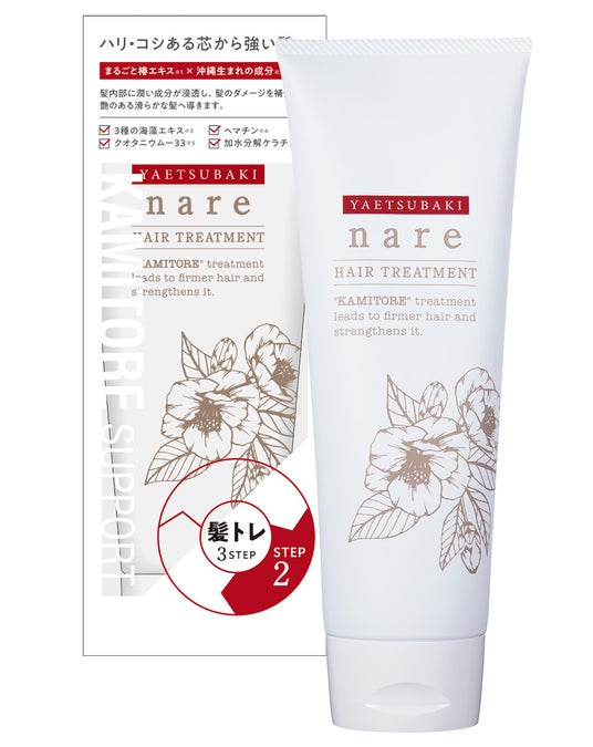 そこで、同じ悩みを抱えた企画開発者が研究員とともに、ヘアケアスペシャリストたちの声を参考にしながら「YAETSUBAKI nare」を開発。「YAETSUBAKI nare」は美髪のためのトレーニング「髪トレ」として、毎日のバスタイムで手軽に取り入れられる『トレーニングメソッド』を提唱しています。こだわり成分として、椿油だけでなく、種子、葉、花エキスをまるごと入れた"まるごと椿エキス"と厳選した4つの沖縄産植物エキスを配合し、傷んだ髪を補修して指通りの良い美しいツヤ髪へ導きます。毎日使うヘアケアで手軽に『髪を鍛える』トレーニングができるよう、成分や処方だけではなく使い方にこだわった製品にしました。