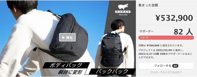 式会社エルグラン(所在地::大阪府東大阪市)は、"ボディバッグからバックパックに瞬間変形するバッグ"【KABAG transform】を、クラウドファンディングサービス『Kibidango』にて公開しました。プロジェクト開始初日で目標金額を達成し、商品化が決定。当商品は、ユーザーの声を元に改良してきたKABAG「トランスフォームバッグ」シリーズ、7代目の最新作です。
