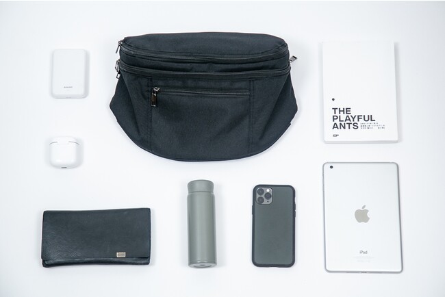 ボディバッグの容量は4.1L。財布や水筒(500mlペットボトルも可)、iPad mini、本、スマートフォン、モバイルバッテリー、イヤホン、鍵など、普段使いに必要なものはひととおり収納できます。