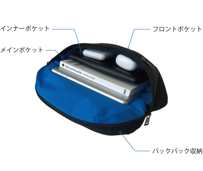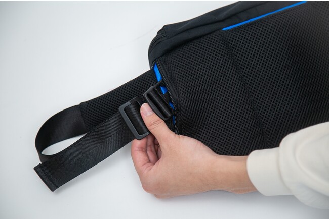 バックパックとして使用する際、ボディバッグのベルトは背面のファスナー付きポケットに収納できます。
