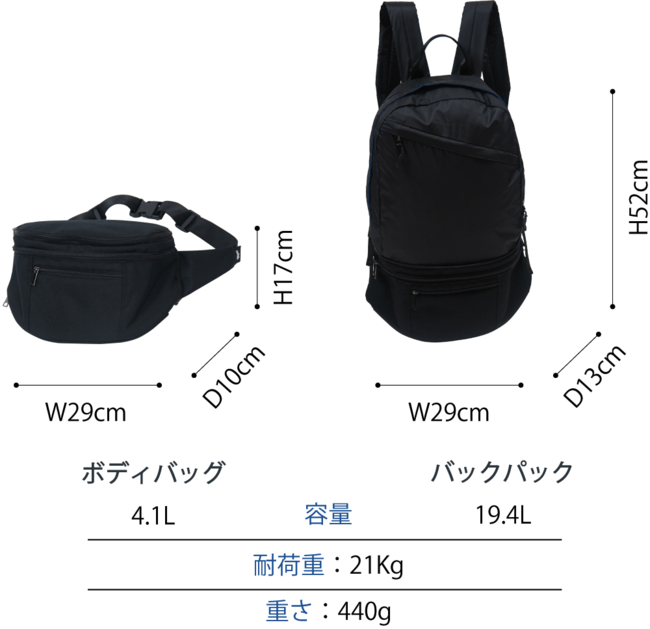 拡張部分の容量は15.3Lで、バックパックでは計19.4Lです。また、ボディバッグ部分とは収納スペースを分けているため、中で物が混ざることもありません。
