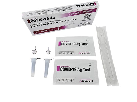 一般用検査薬(第1類医薬品)である「スタンダードQ COVID-19 Ag Home Test(一般用)」は、鼻腔ぬぐい液を用いて、新型コロナウイルス抗原の検出を15~30分で行います。体調が気になる場合のセルフチェック用として、薬局・ドラッグストアまたはインターネットにてお求めいただけます。