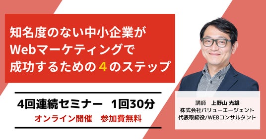 中小企業を対象にしたWebマーケティングなどを手がけている株式会社バリューエージェント(本社:大阪府大阪市、代表取締役:上野山 光雄)は、オンラインセミナー「中小企業がWEBマーケティングで成功するための5つのステップ」を2つの日程で開催いたします。